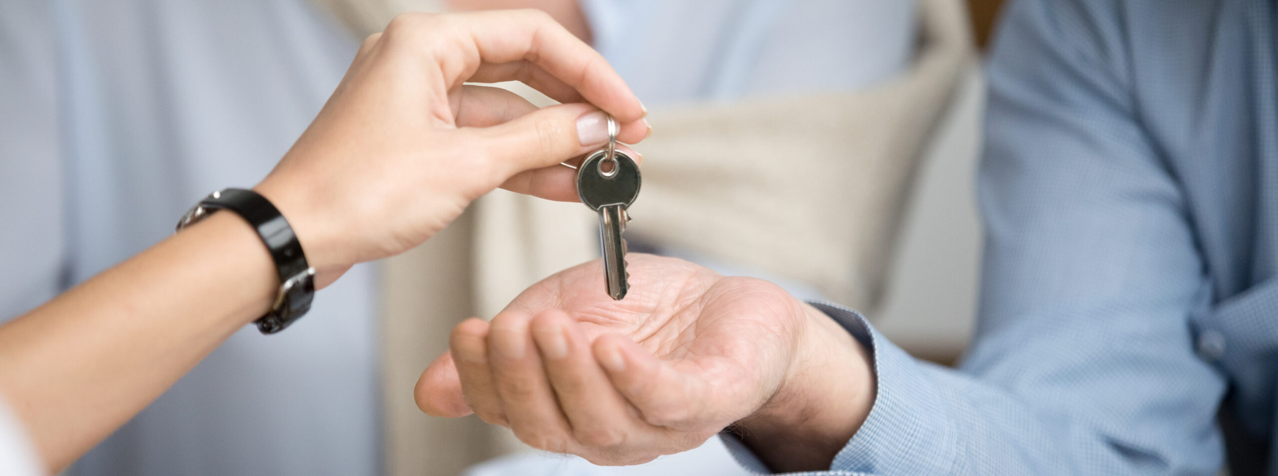 Horizontal photo couple receiving keys to new home from agent